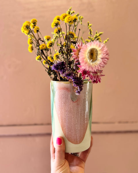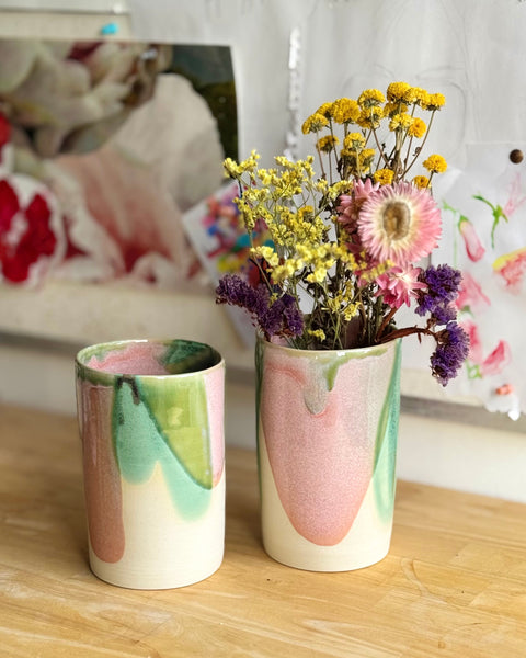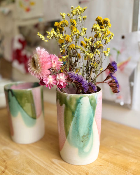 Handmade pottery is a slow and in-depth process that takes 2–3 weeks from start to finish for each batch of pottery. Every mug is designed and made by Nicole, working part-time from her sunny backyard studio, while also making time to completely switch off from her business and be with her family and two young kids.