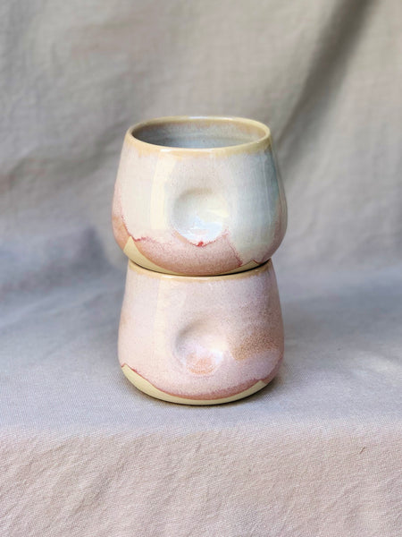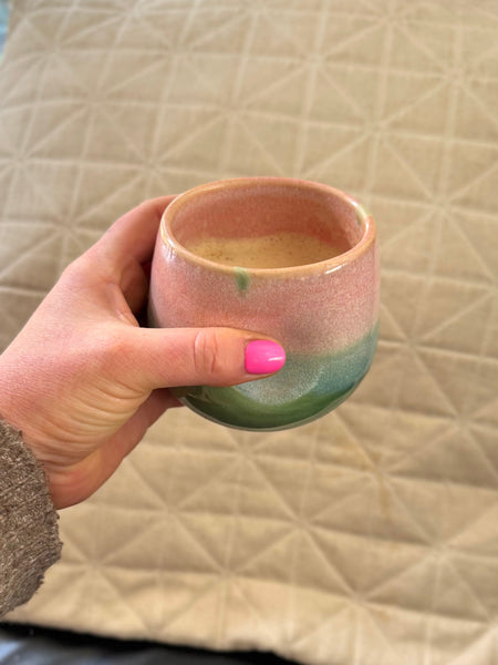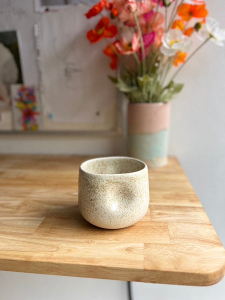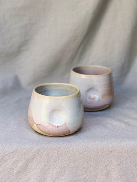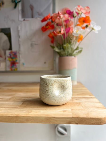 With a gentle dimple on each side, these mugs invite your fingers to pause—making every sip a moment of comfort in your daily ritual. Each dimple is pressed in by Nicole’s hand a few hours after the mug is thrown on the wheel, while the clay is still soft yet firm enough to hold its shape.