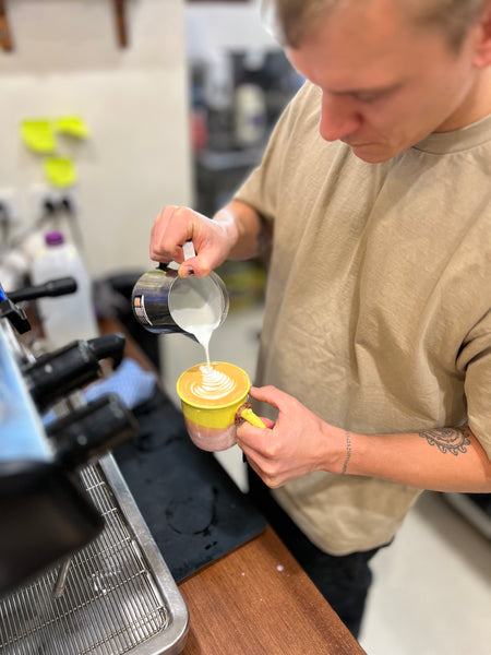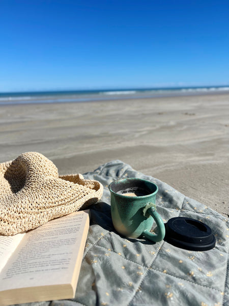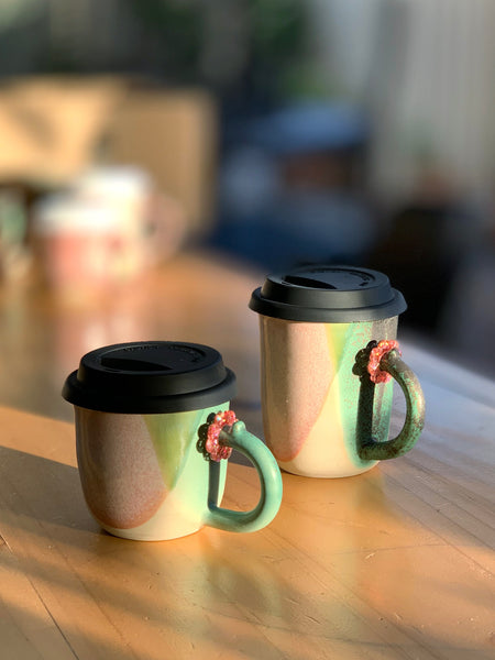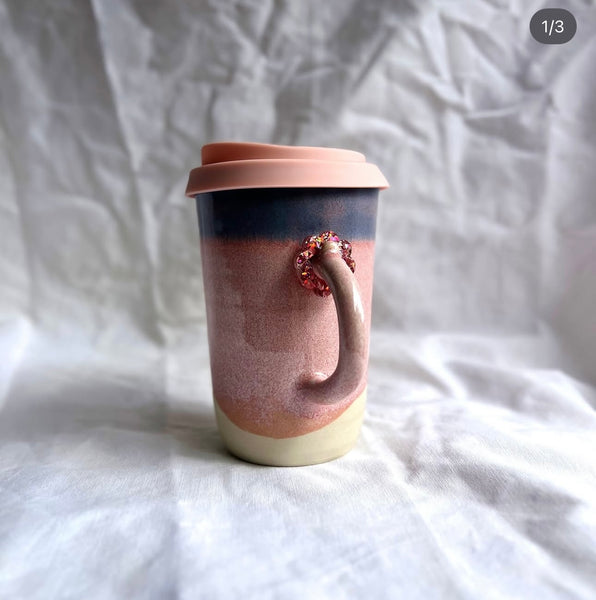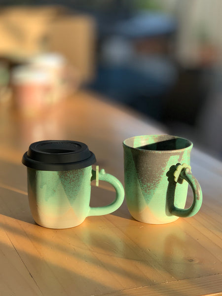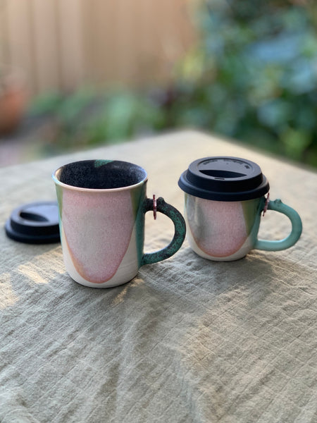 Handmade with Australian mined stoneware clay by Nicole in South Australia. The mug is glazed, fired twice in the kiln, and paired with a food grade, non-toxic silicone lid. Keeping your coffee safe, warm, and helping protect our precious environment all at once.