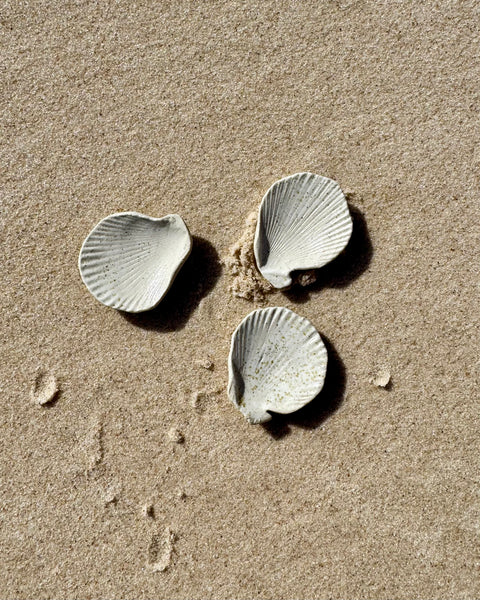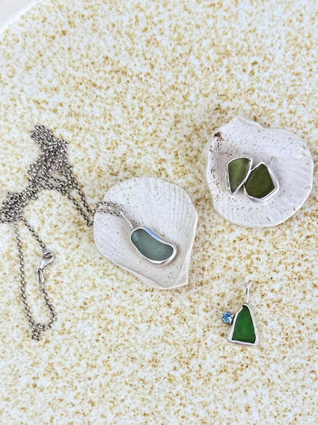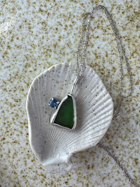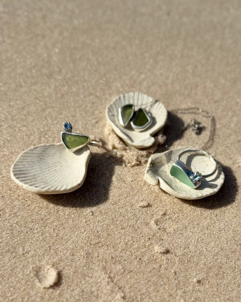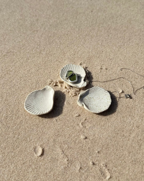 A seashell souvenir from my local beach — I collected a pretty shell on a beach walk and used it to shape a small jewellery dish, made especially for your sea glass treasures.